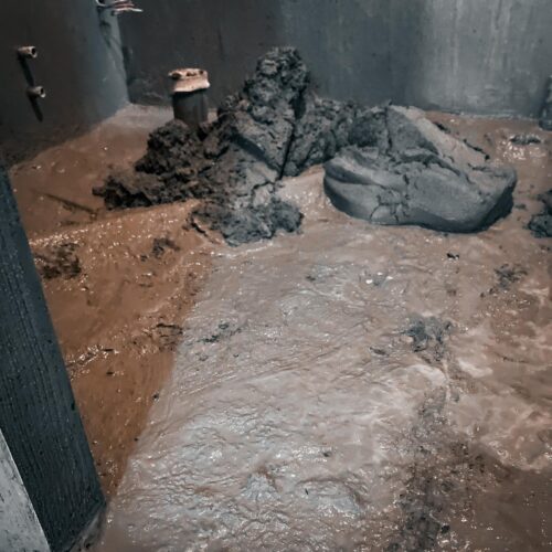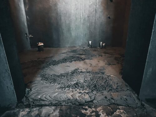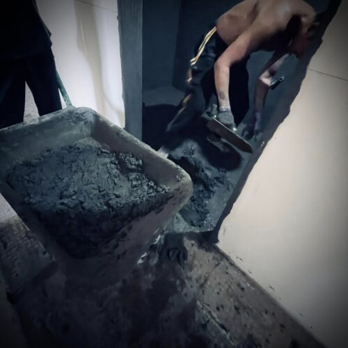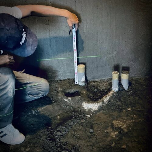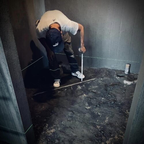 浴室牆壁粗胚結束,接著就是地板的打底,作法跟牆壁大同小異,只是不需要在有模基塊(麻吉)的輔助,因為模基塊是用在牆上的,地板用雷射水平儀確定完成面高度、測量洩水斜度,這樣可以知道底要墊高多少,浴室管線也都要被水泥砂漿覆蓋。