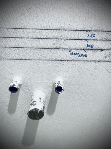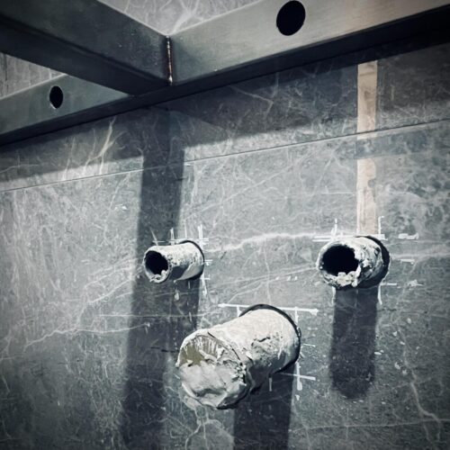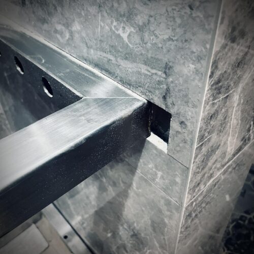 當牆壁貼60*120公分的大片磁磚,我會擔心不銹鋼固定的時候鑽裂了磁磚,或是震動產生磚裂。所以就先預留出固定架的位置,為的就是讓鐵架直接固定在牆上,而不是鑽過磁磚才固定在牆上。