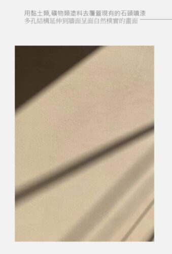 土黃及紅褐:這是北非特有的沙漠、岩石、泥、沙等天然景觀顏色,再輔以北非土生植物的深紅、靛藍,加上黃銅,帶來一種大地般的浩瀚感覺。因此我們特地選用自然健康的天然材料,成分只有泥土跟糯米的天然塗料,搭配手感肌理不規則的粗砂礫天然礦物泥土,塗滿在天花板與牆面。