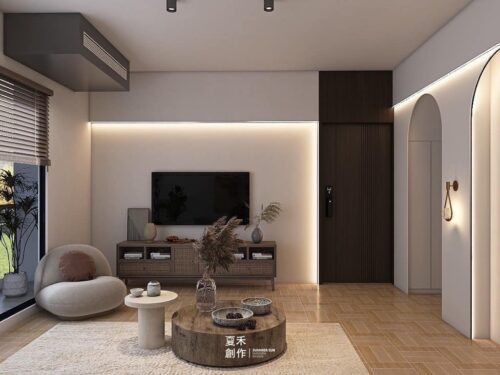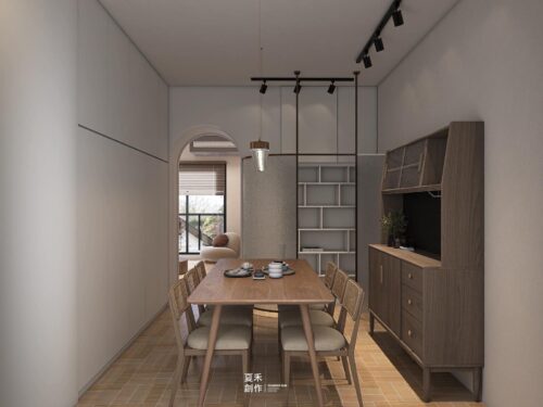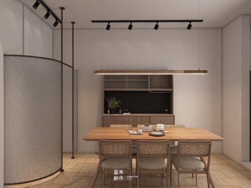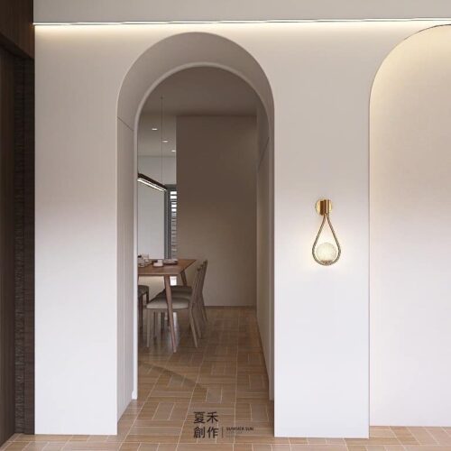 不修邊幅的線條是構造形態的基礎,拱門與半拱門、馬蹄狀的門窗、白牆、色彩明度低、線條簡單且修邊圓潤的木質傢俱。圓形拱門串連公區客餐廳的動線,在走動觀賞中,出現延伸般的感覺。