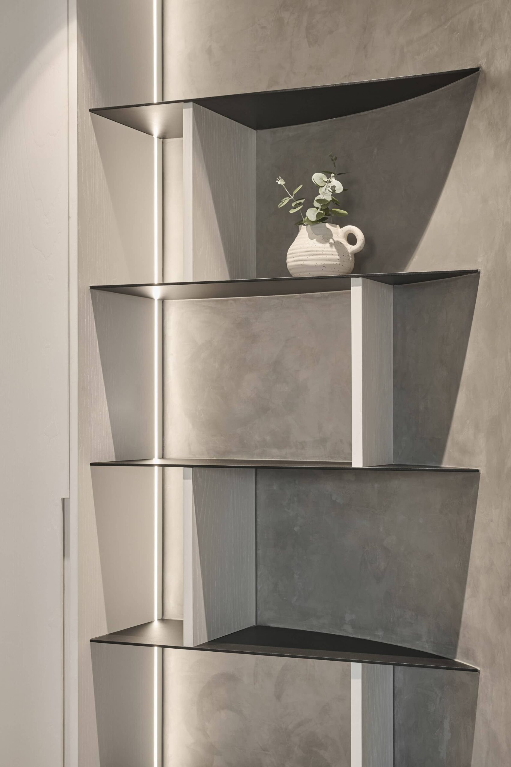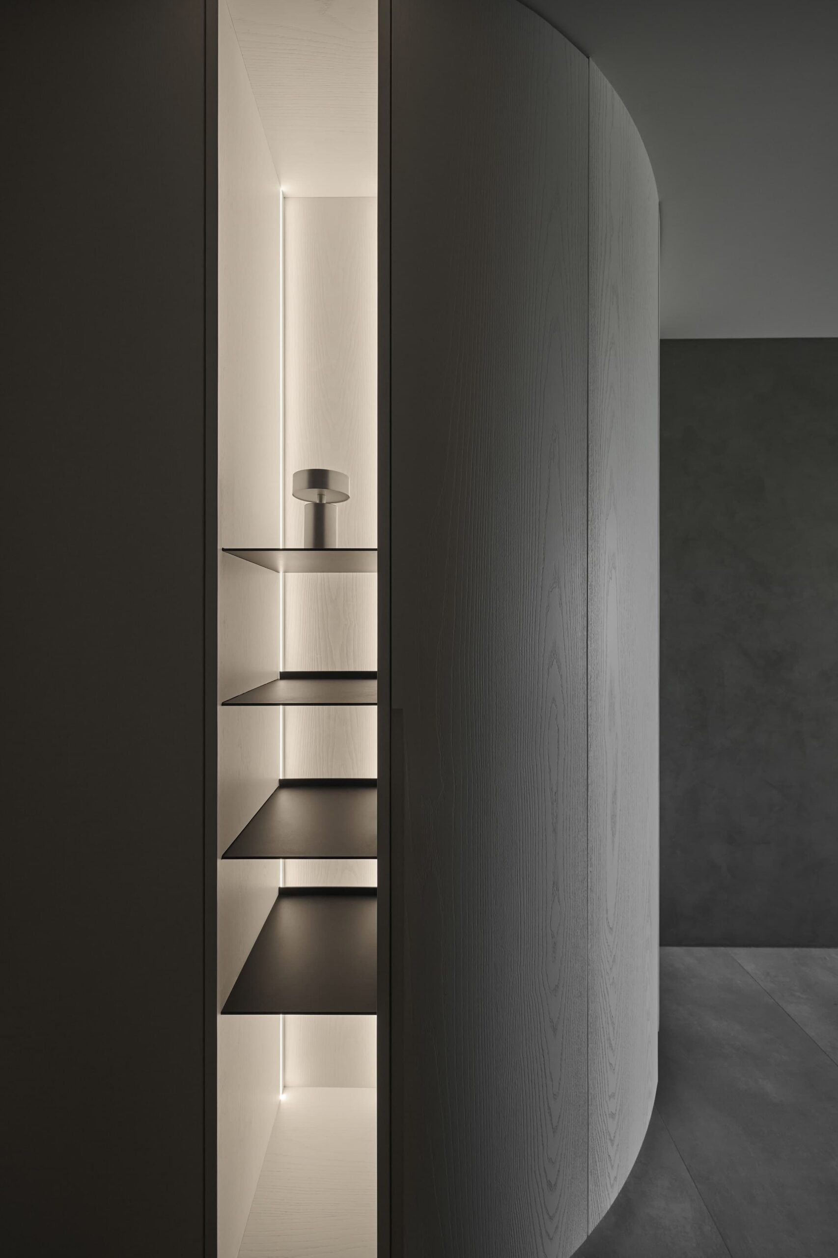 走廊的圓弧形造型內,隱藏了家電用品的收納,櫃內預留的吸塵器收納架,與門縫下掃地機器人的位置。