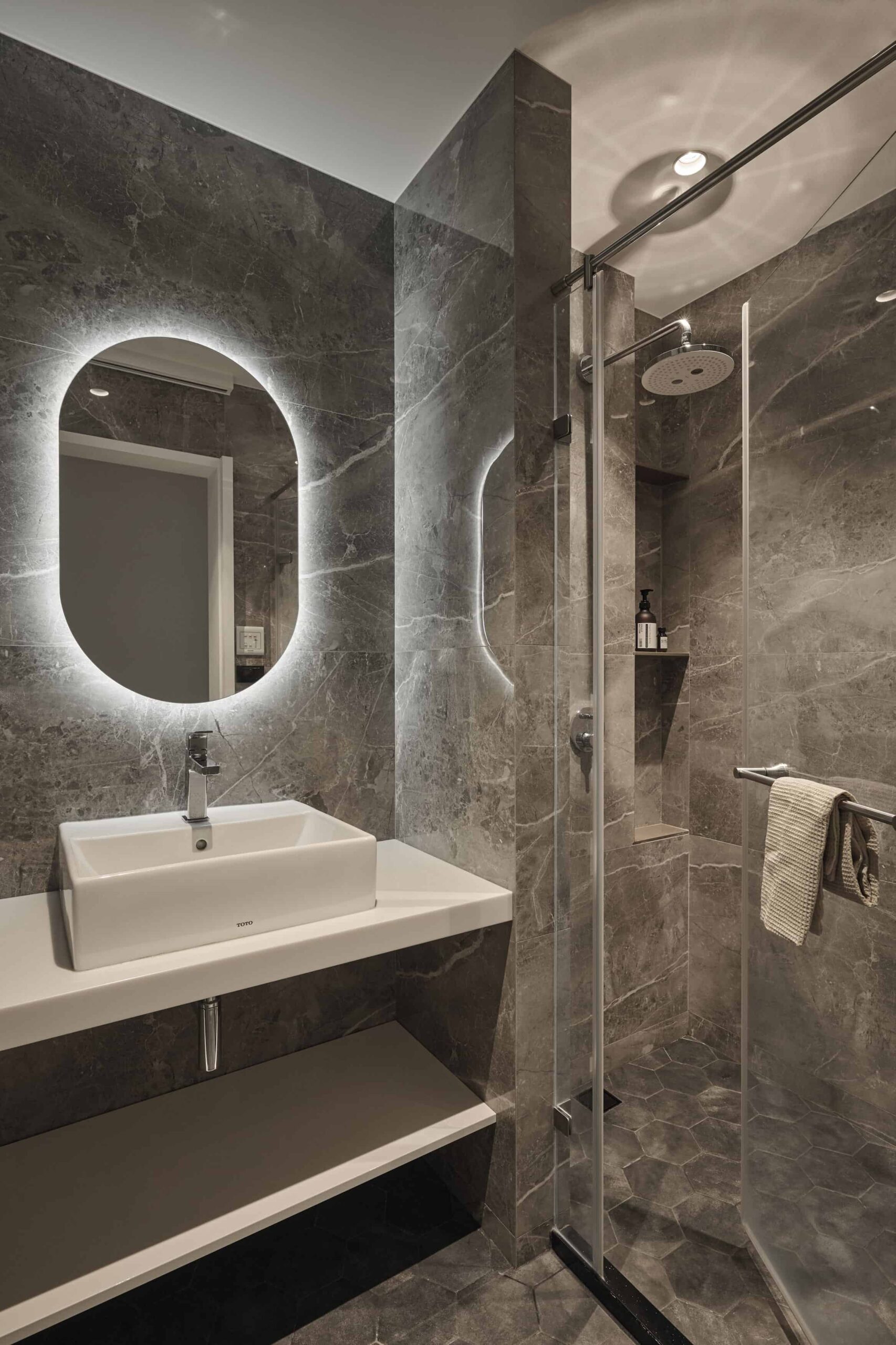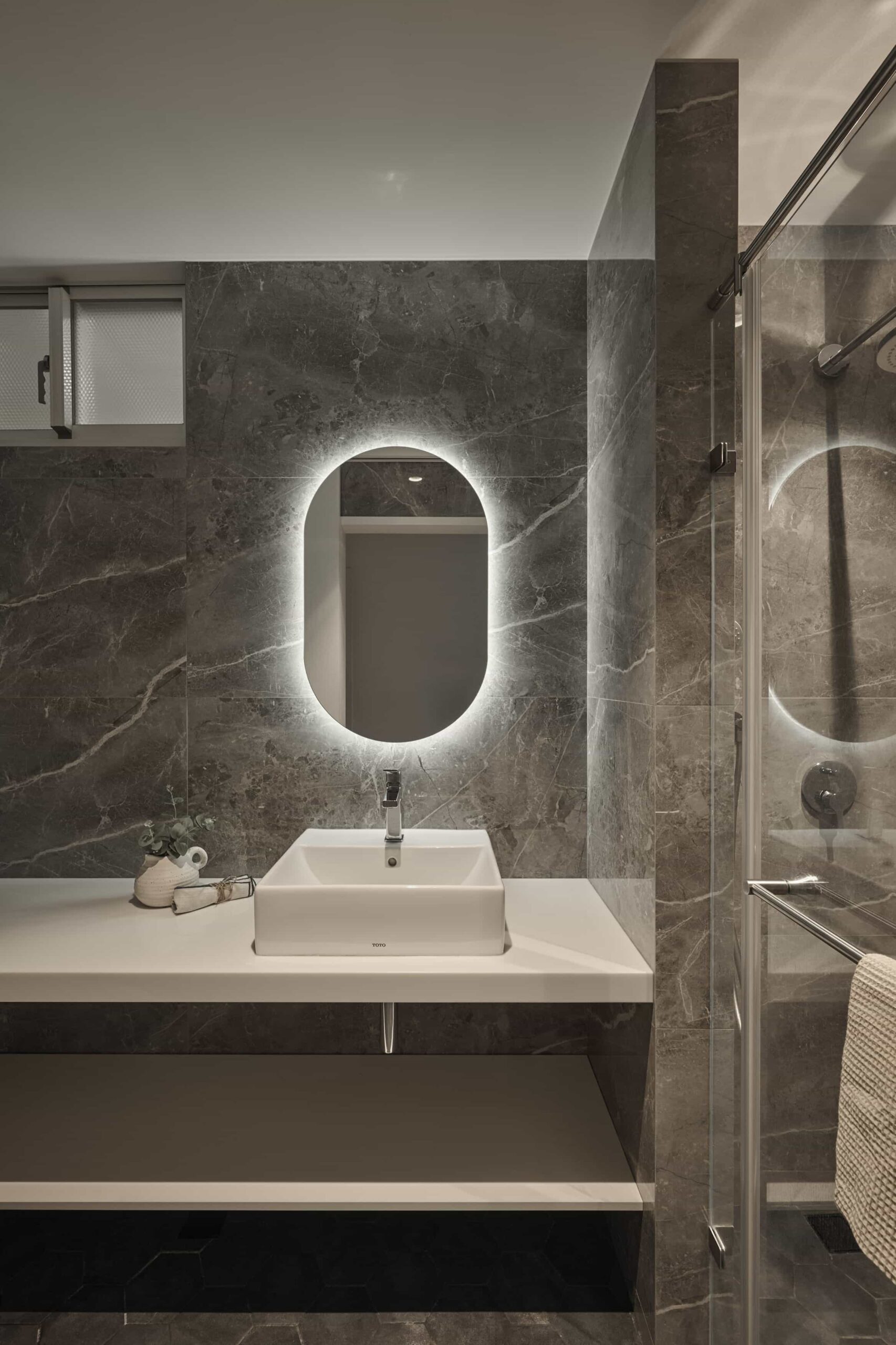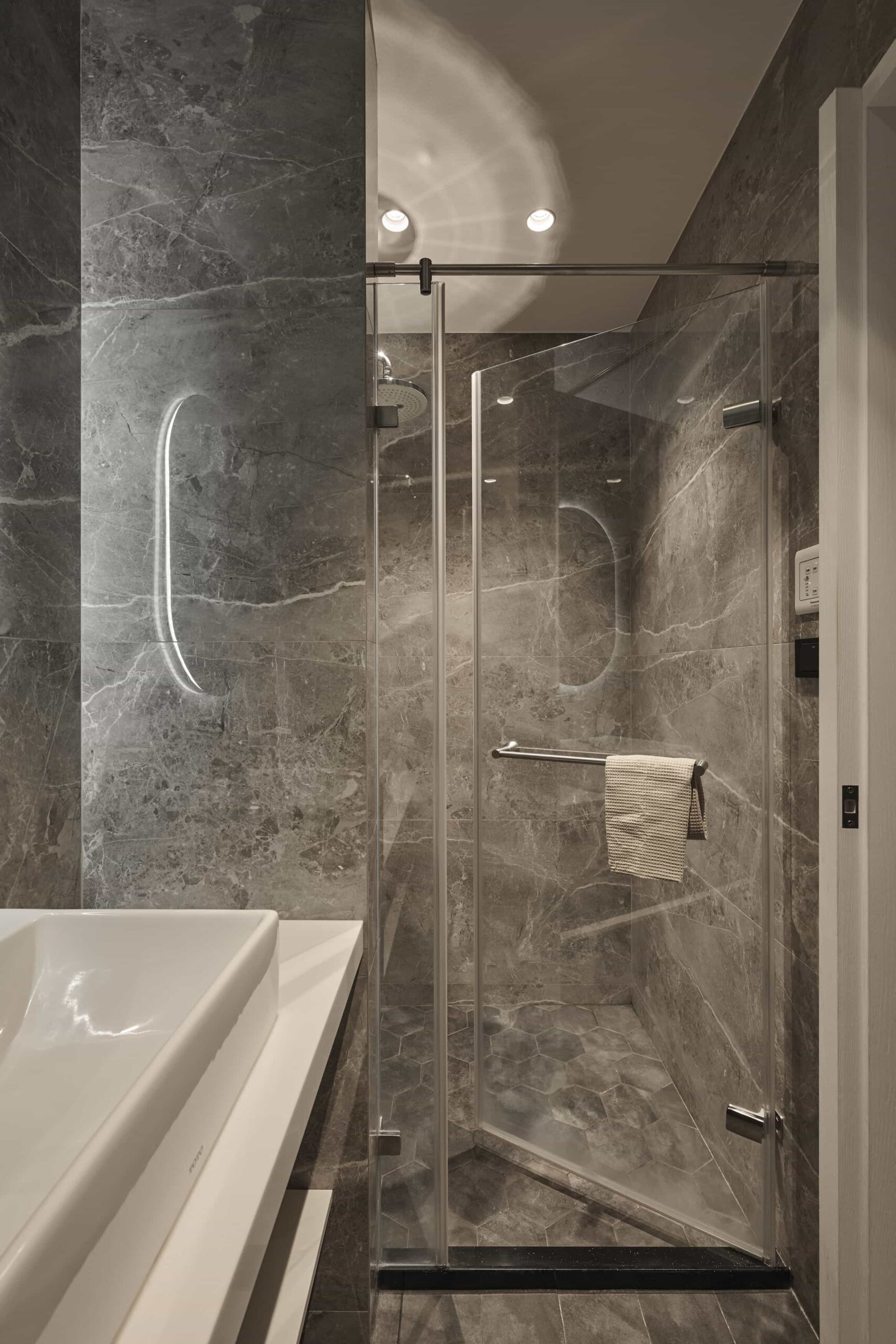 設計師選擇了仿大理石的薄板磁磚,營造出華麗又沉穩的私人空間,主要是延續了公區「寂光之廊」這個主題,讓浴室也充滿詩意與張力。