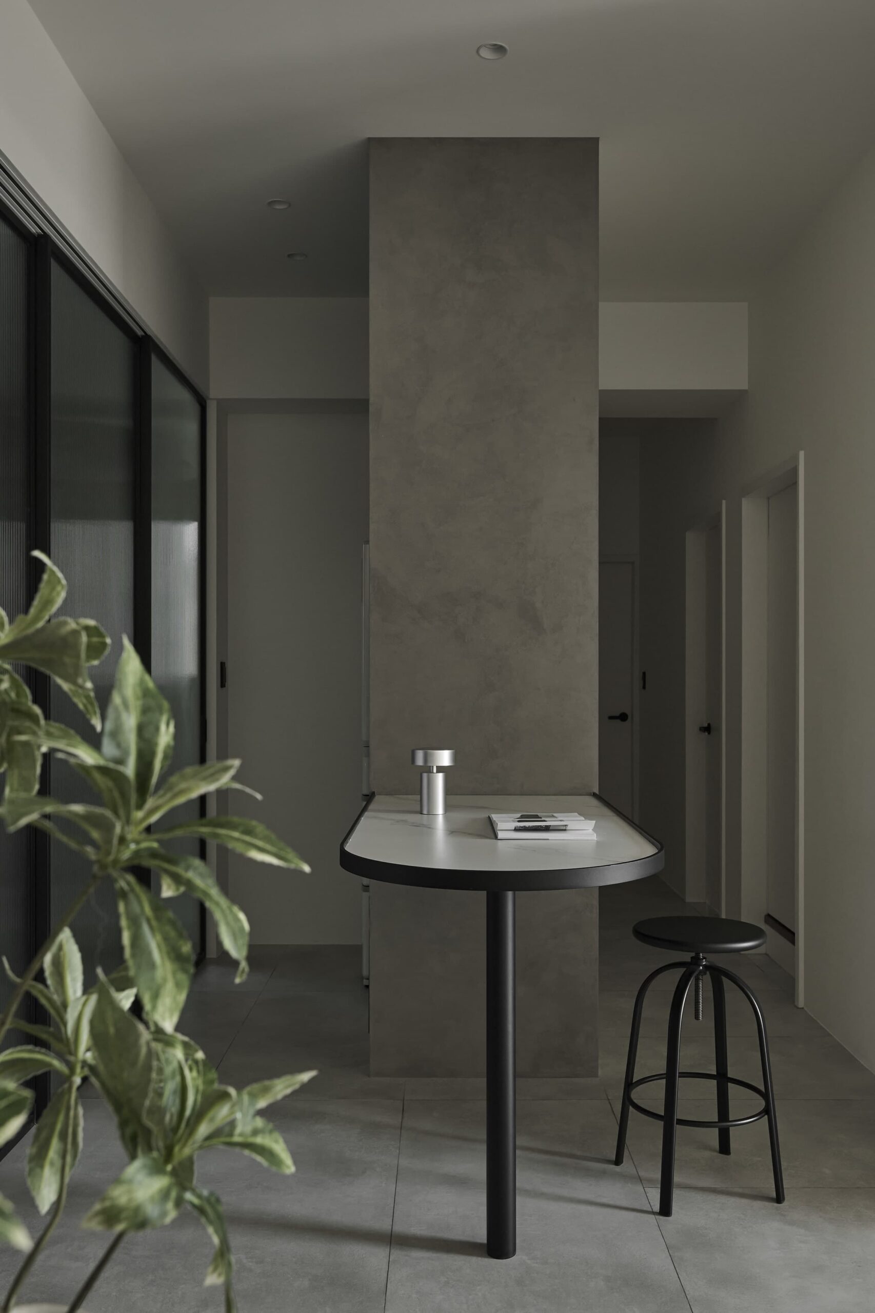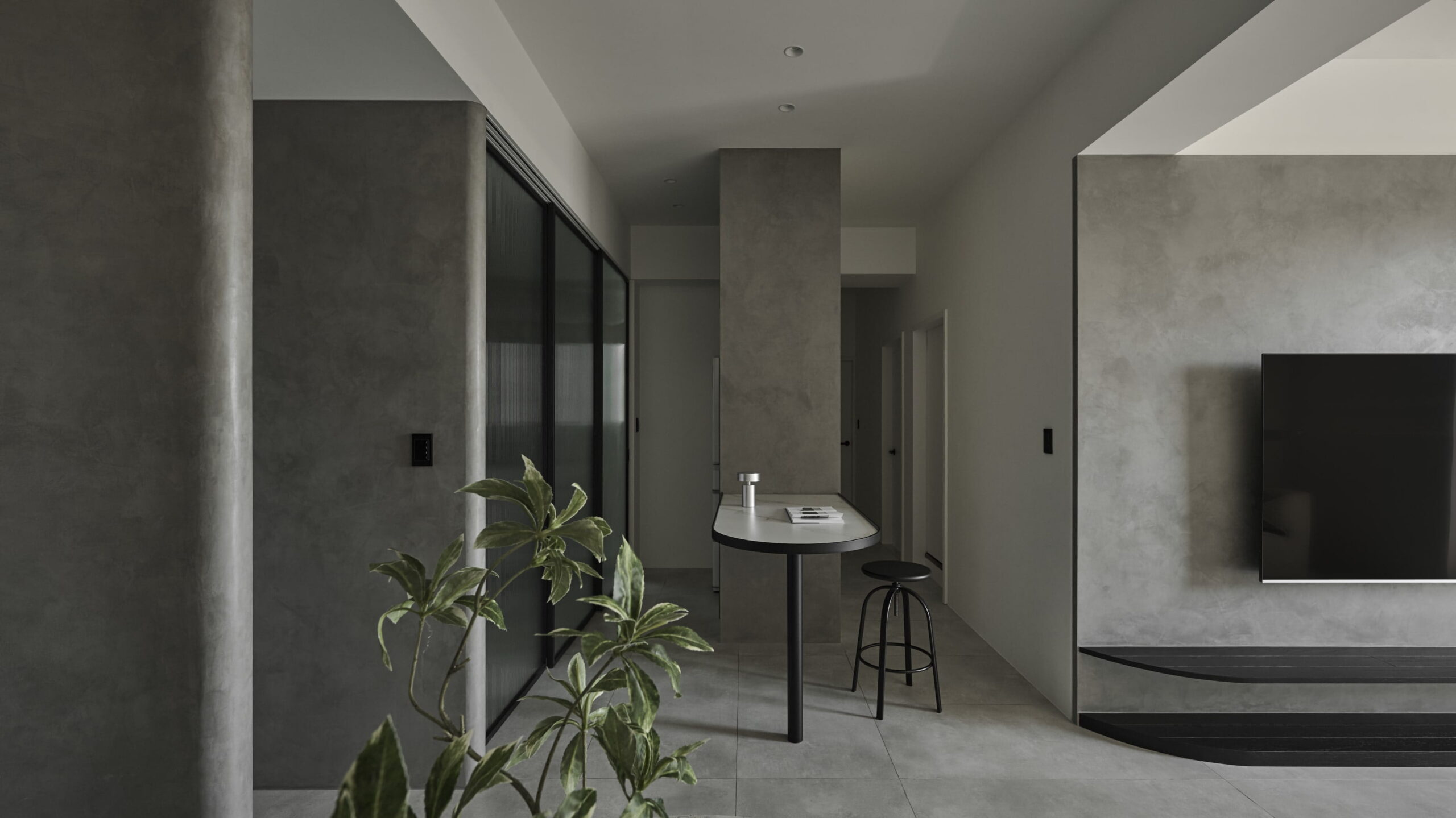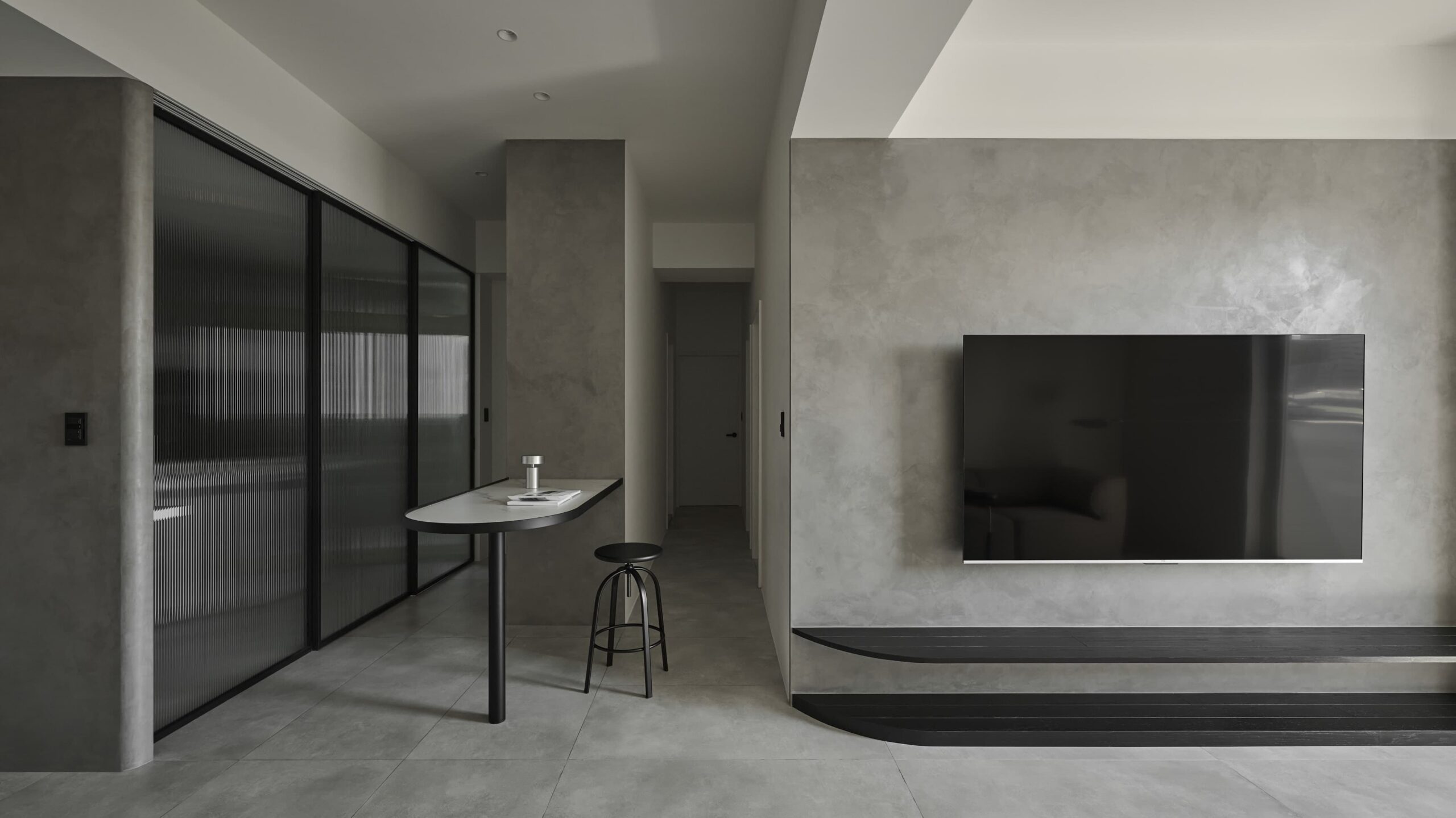 設計以灰階為基調,材質融合清水模質感、霧黑金屬與局部間接光源,