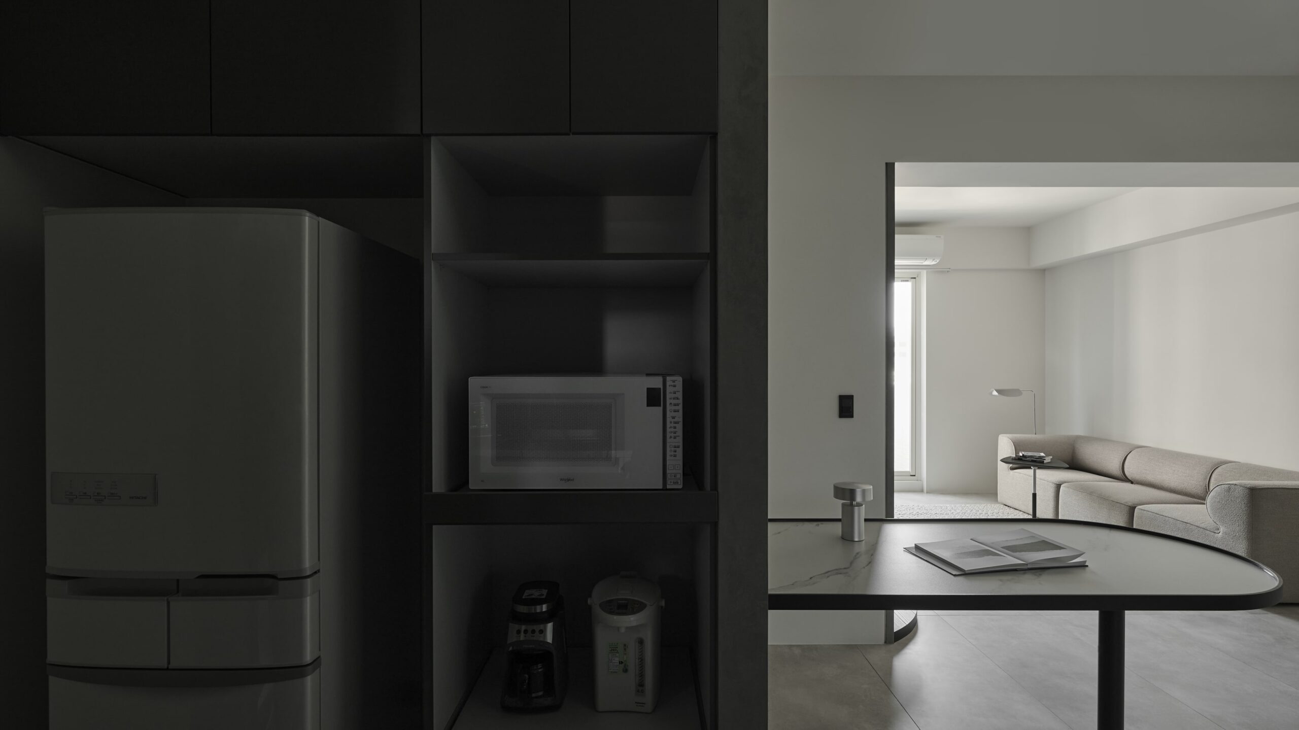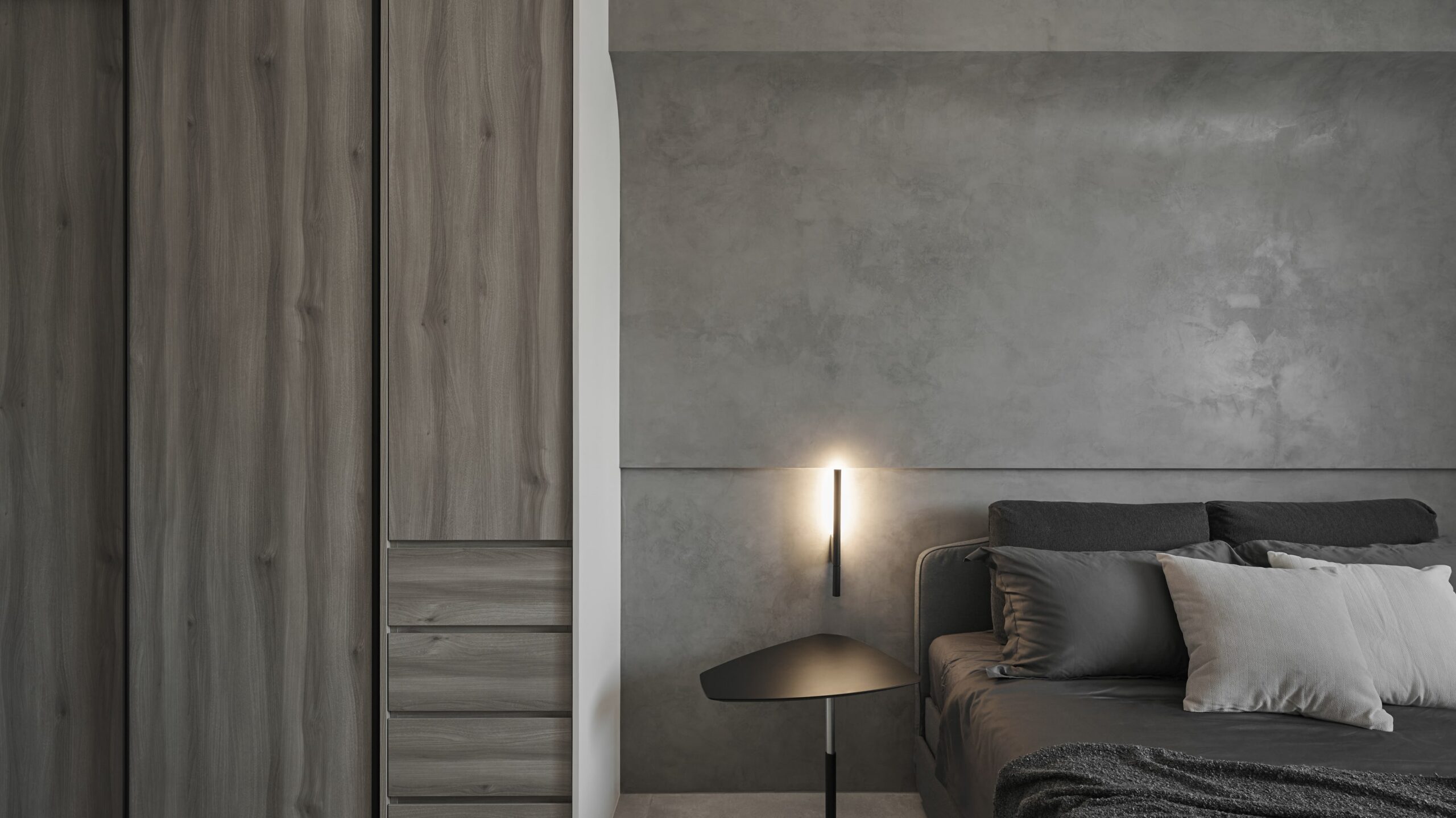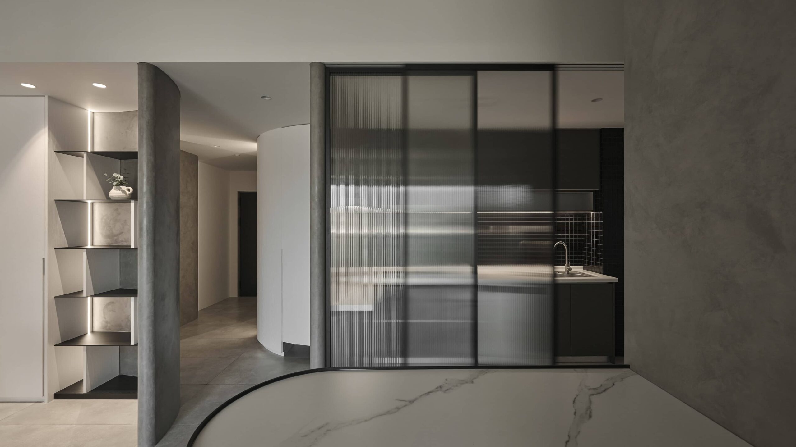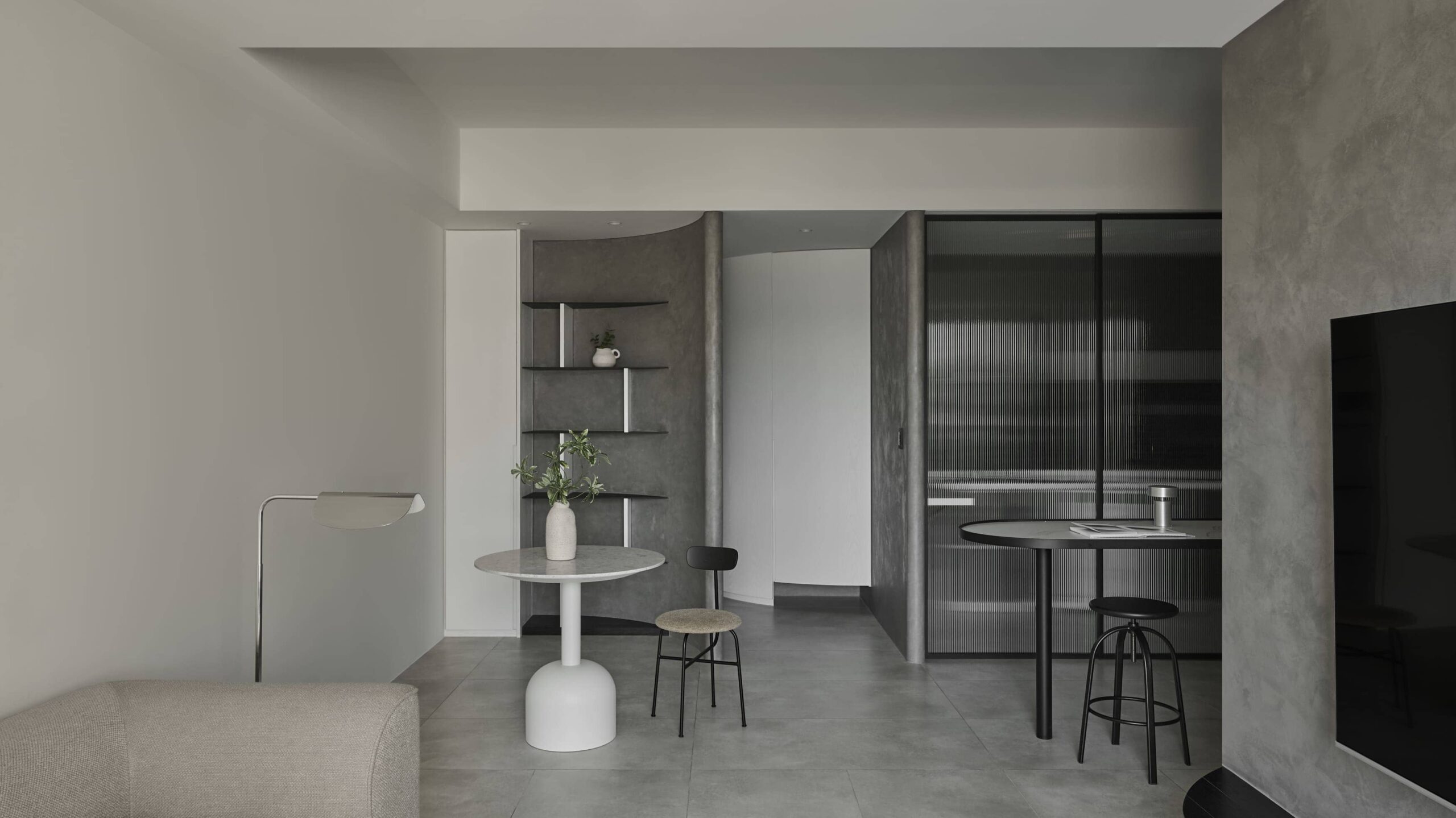 設計以灰階為基調,材質融合清水模質感、霧黑金屬與局部間接光源,