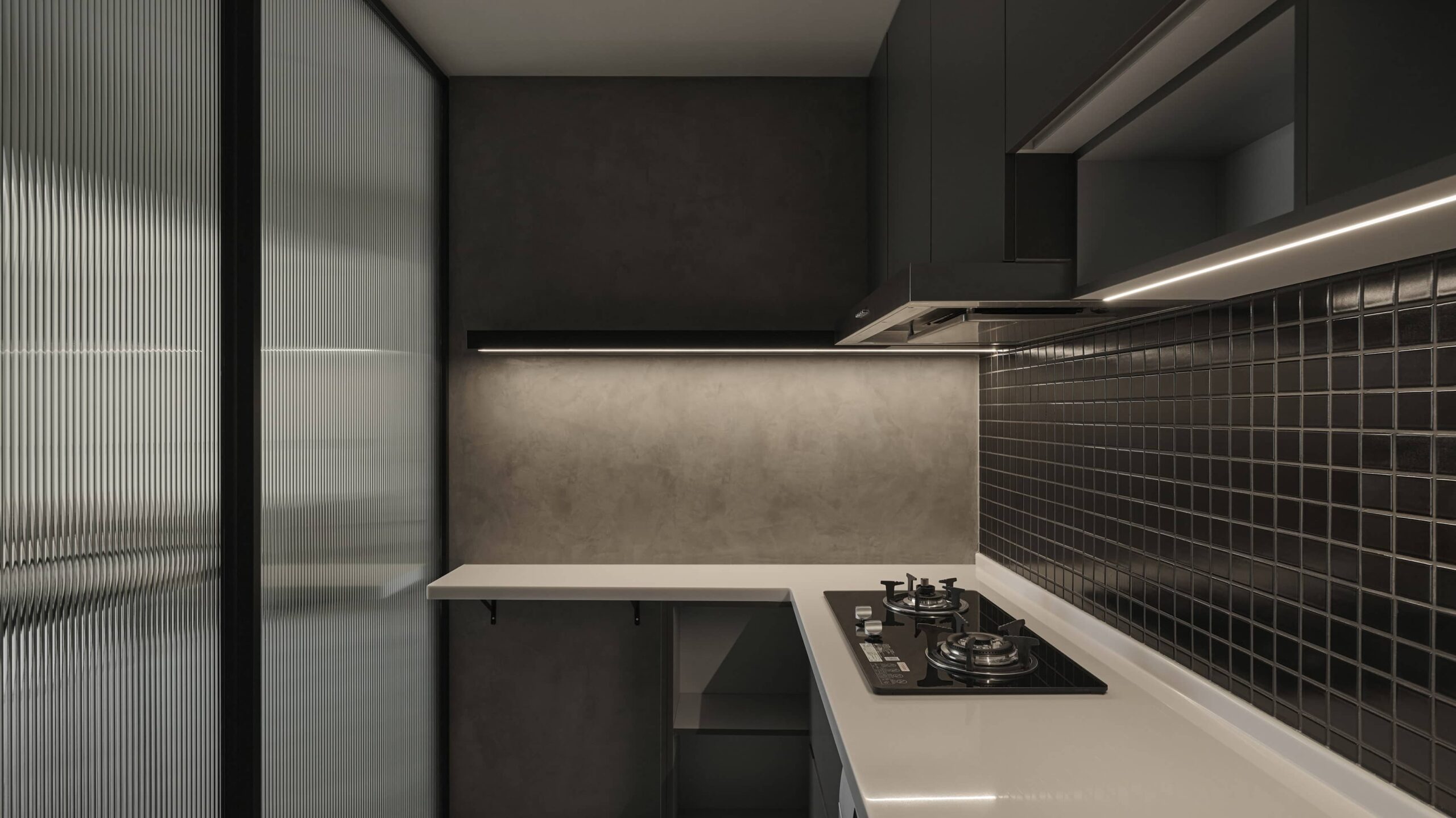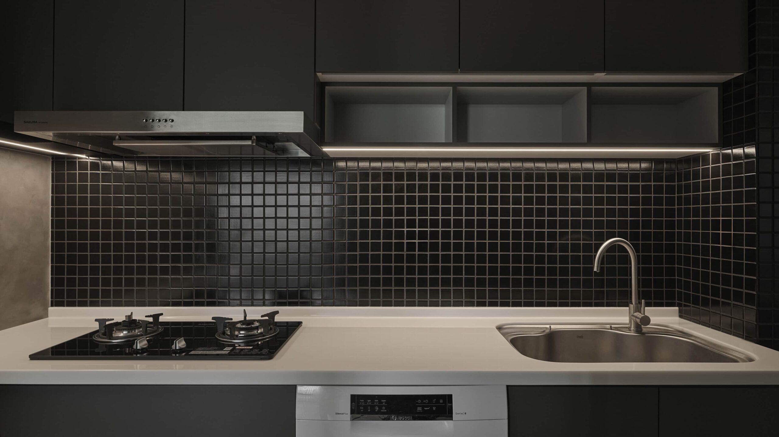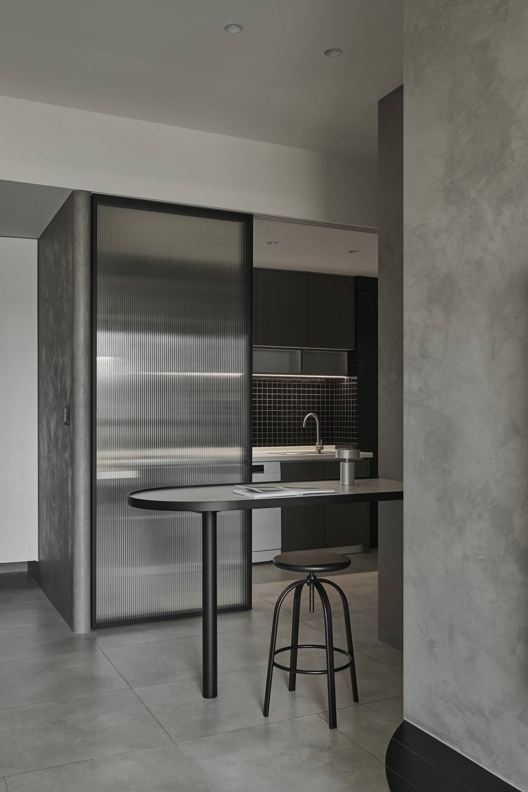 廚房利用滑門式的鋁框玻璃門片搭配長虹玻璃的隱私特性,延伸客餐廳灰黑色調的配色,讓公區的空間感一致。在線條上刻意選用黑色馬賽克磚,更貼近屋主樸實無華的日常。