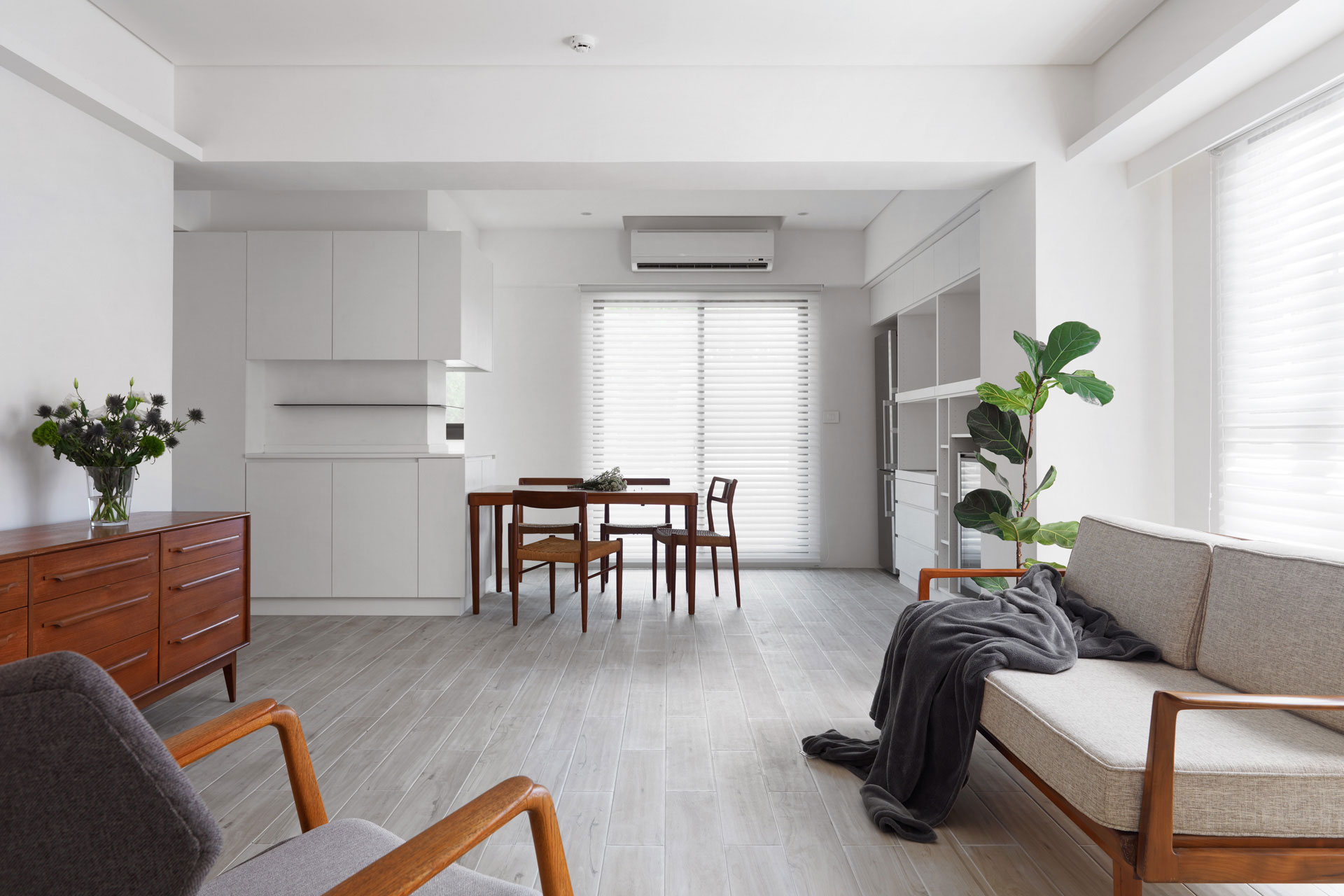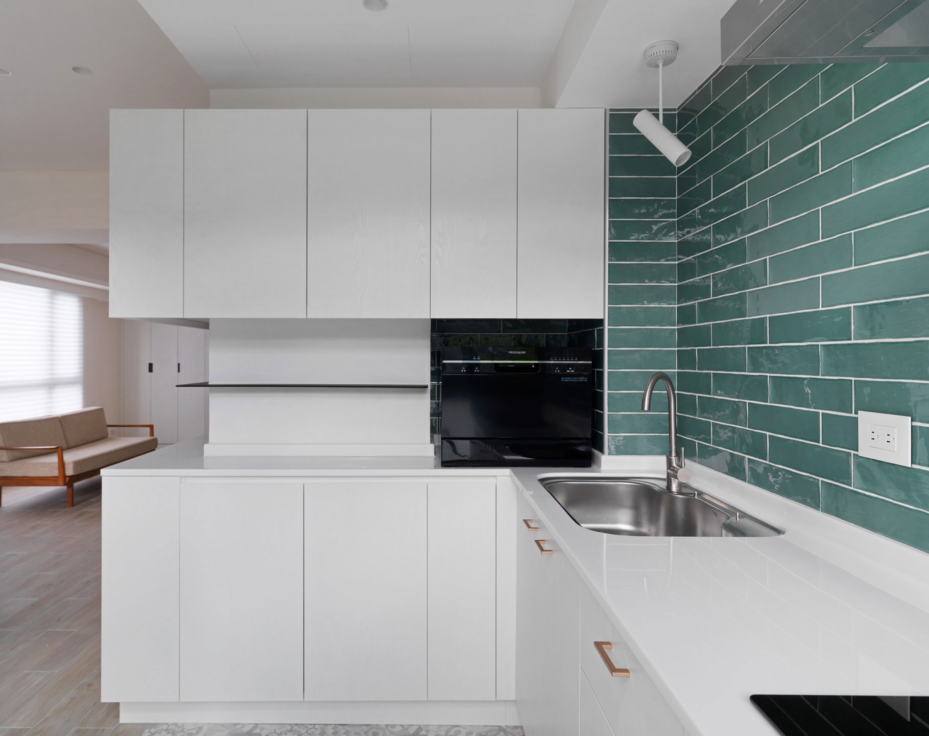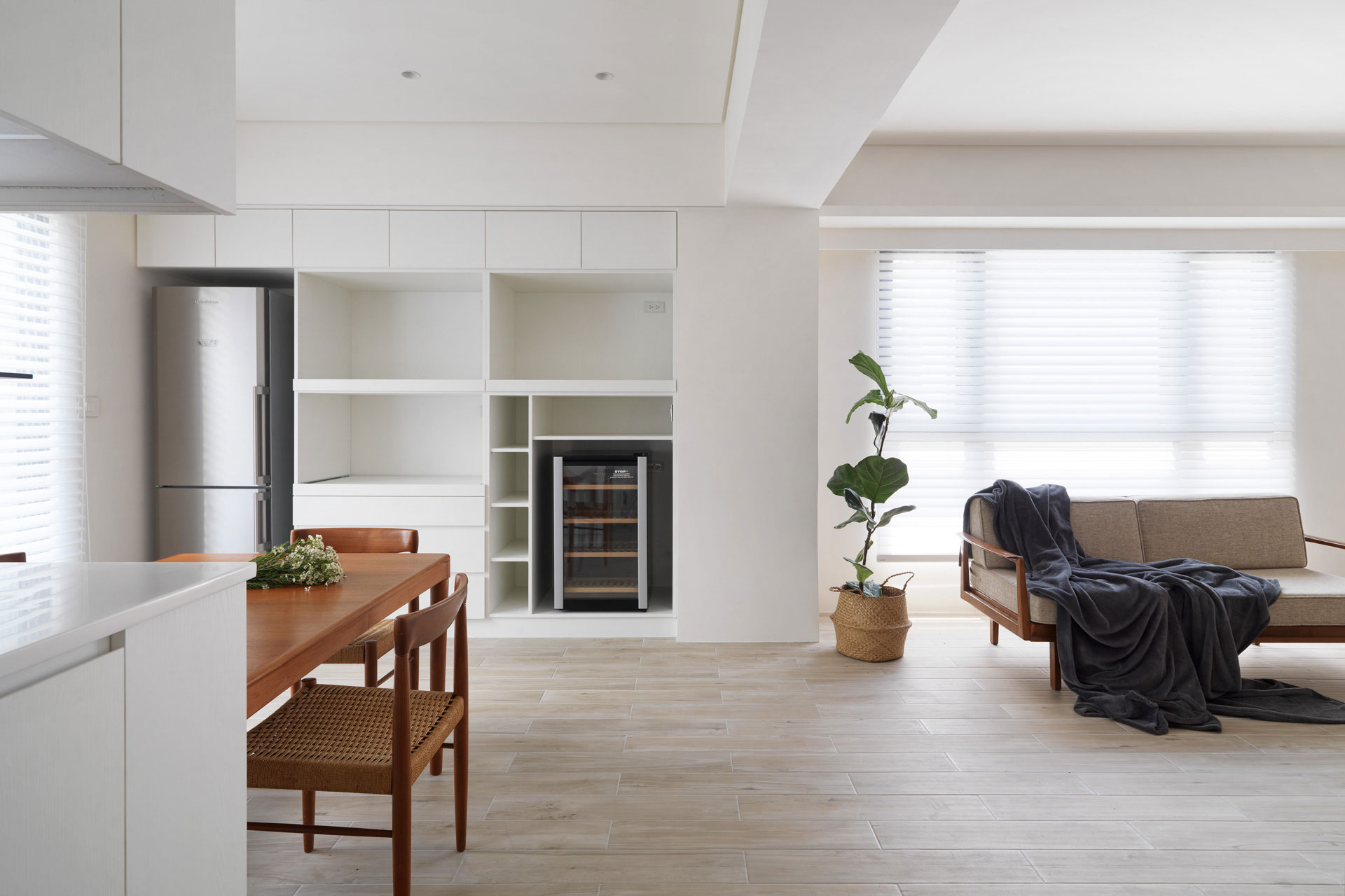 作者: user / 15 4 月, 2025 室內面積|室內20坪裝修需求| 全屋規劃房屋狀態|10年新古屋 格局|集合住宅主要建材|長型木紋磚,日本珪藻土,義大利復古磚,木紋白色系統板,玫瑰金五金,75%透光柔光簾 這個設計以一字形為主軸,將空間都留給公領域,使客廳、餐廳和廚房串聯在一起,運用開放式格局消除了牆壁的隔閡,讓整個空間看起來更寬敞、通風。單純的流暢動線,讓人在空間中自由穿梭,不受阻礙。並重新打開廚房的天窗和落地窗,巧妙地借景取景,將戶外的山景引入室內。這不僅增加了視覺深度,還讓室內與自然融為一體。小空間的開放式格局,以其簡約、優雅和實用的特點,展現了「少即是多」的美學精髓 homify媒體報導 100室內設計-屋主專訪與回饋