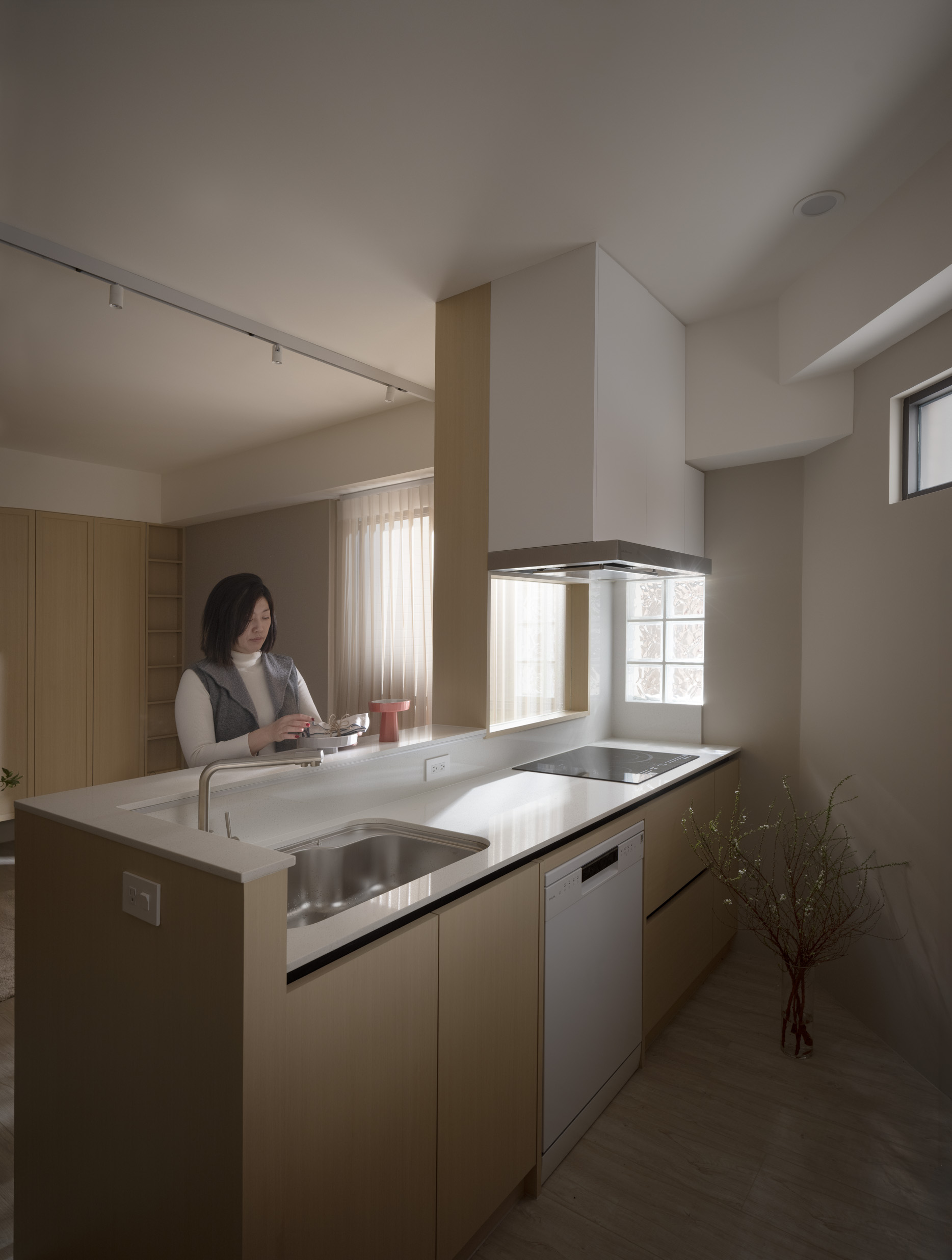 小宅中的複層吧檯不僅加高也加深,使人與人之間的互動更加方便。半高的吧檯巧妙地阻擋了視覺上的雜物,卻不失去互動性。這樣的設計使家庭成員能在烹飪和交流中保持連接,提升了居住的舒適度。