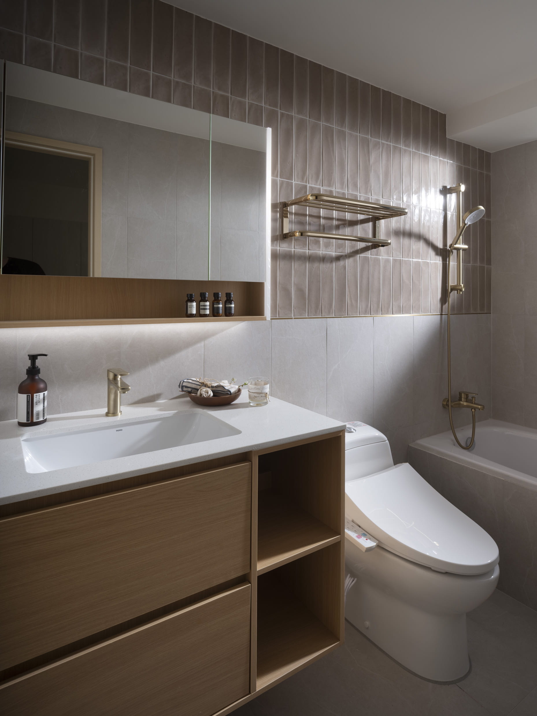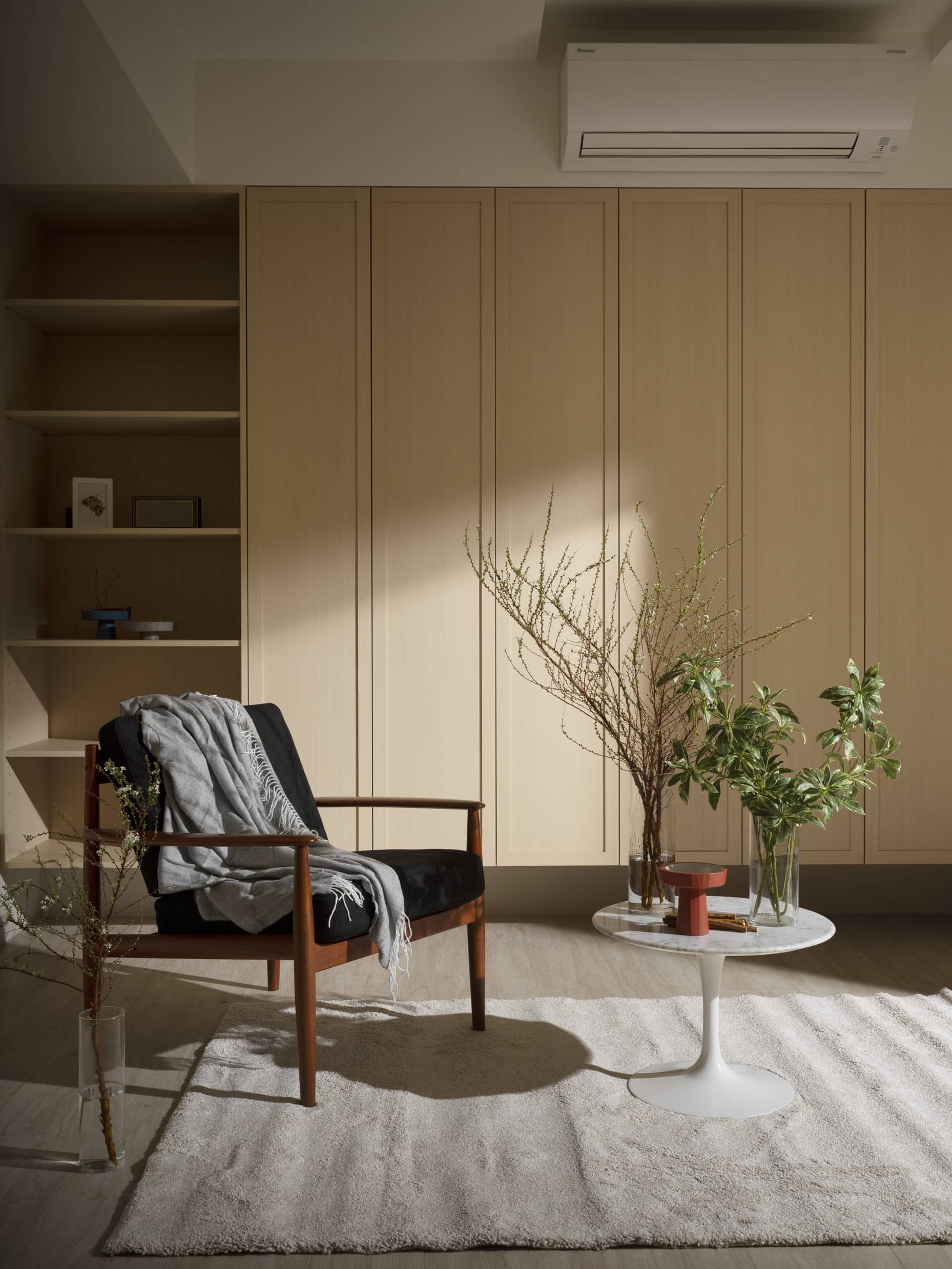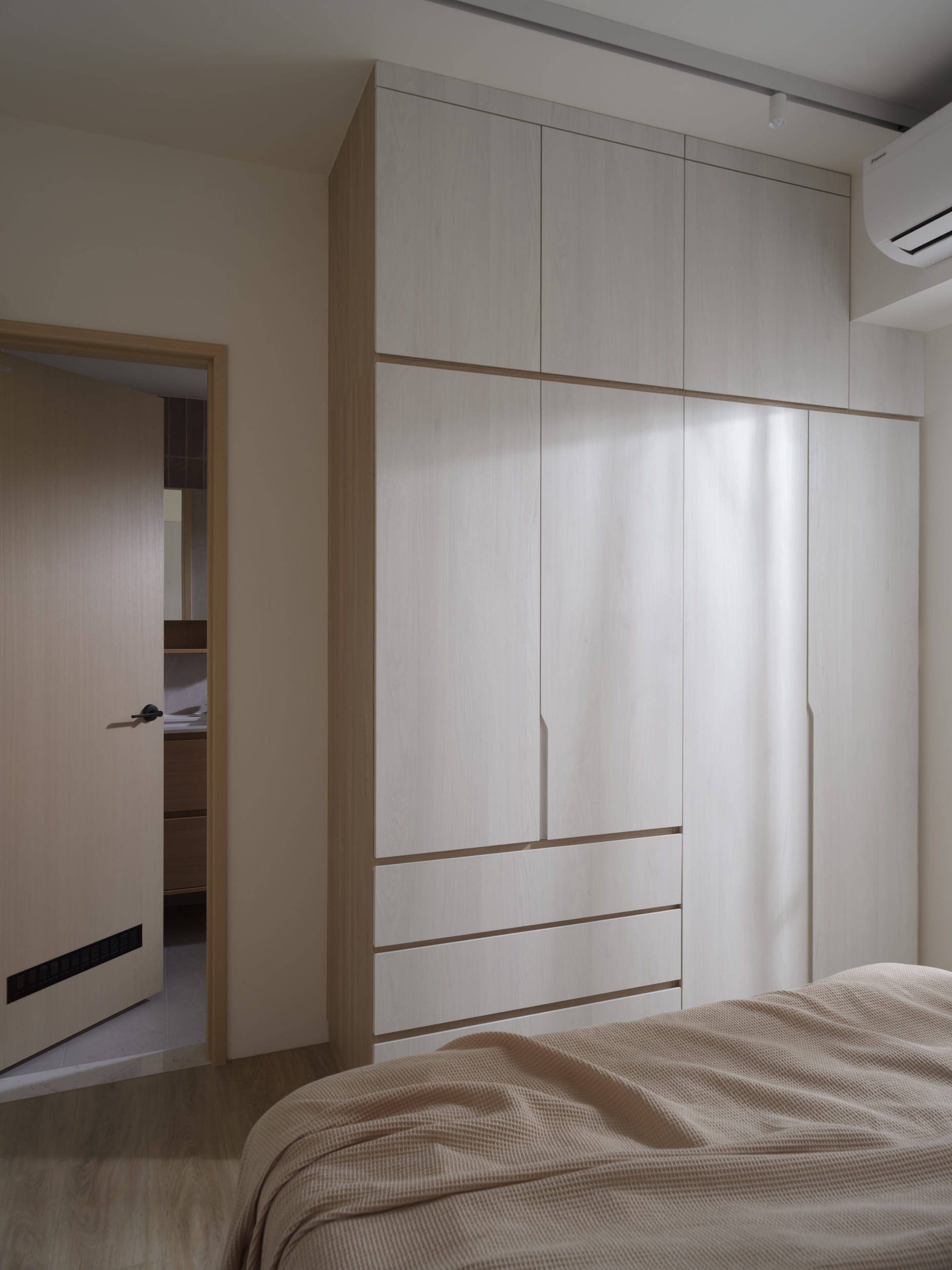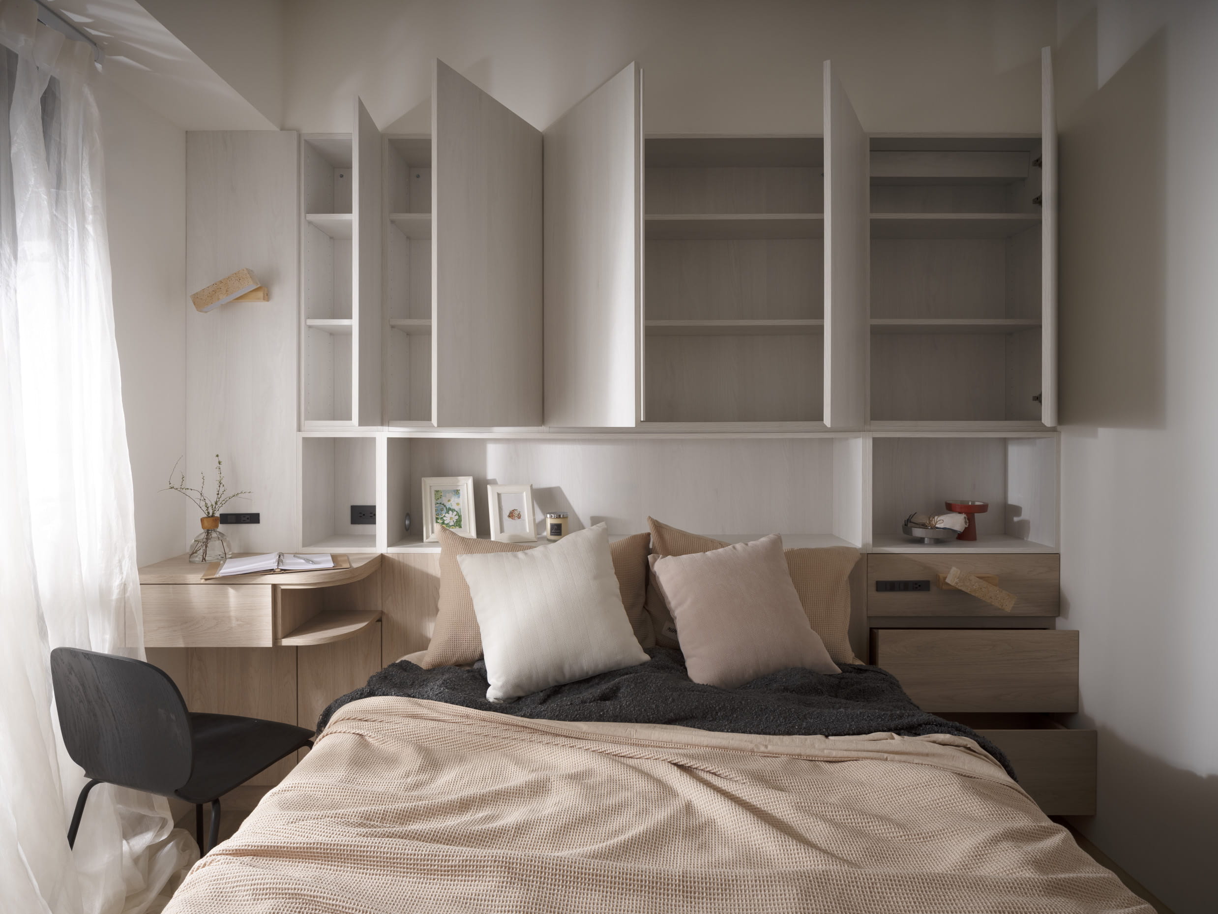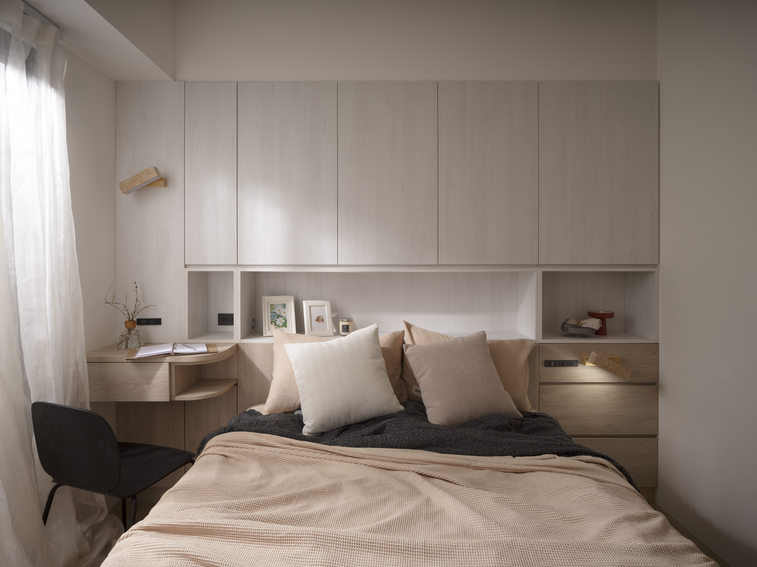 主臥室的設計也非常講究。床頭櫃內縮,使原本寬度有限的走道顯得更加寬敞。床頭背後的樑柱,則巧妙地被備櫃體包覆,不僅完美解決了陽宅風水中大樑壓床的問題,還增加了收納的功能性。此外,主臥室內迷你但實用的化妝台也滿足了女主人的基本需求。