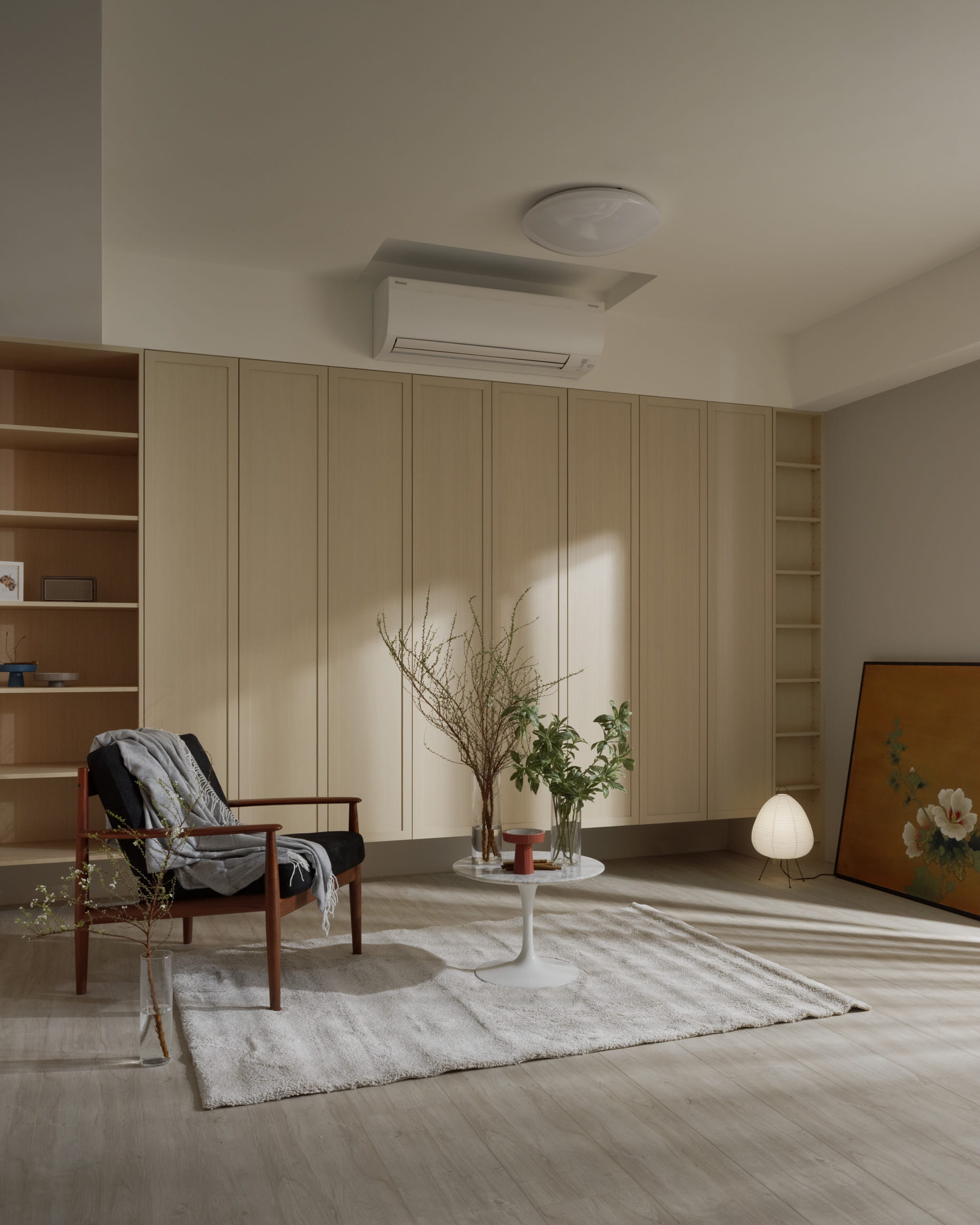 Japandi風格的小宅設計注重每一個細節,通過巧妙的布局和設計,使空間雖小但功能性十足。兩房兩廳兩衛的布局使家庭成員有足夠的私人空間自然光與通透性。Japandi設計注重自然光的引入,使室內光線充足,給人以溫暖和舒適感。通透性的設計使空間感更強,視覺上放大了居住空間。這樣的設計理念不僅提升了居住的品質,還增強了生活的愉悅感。