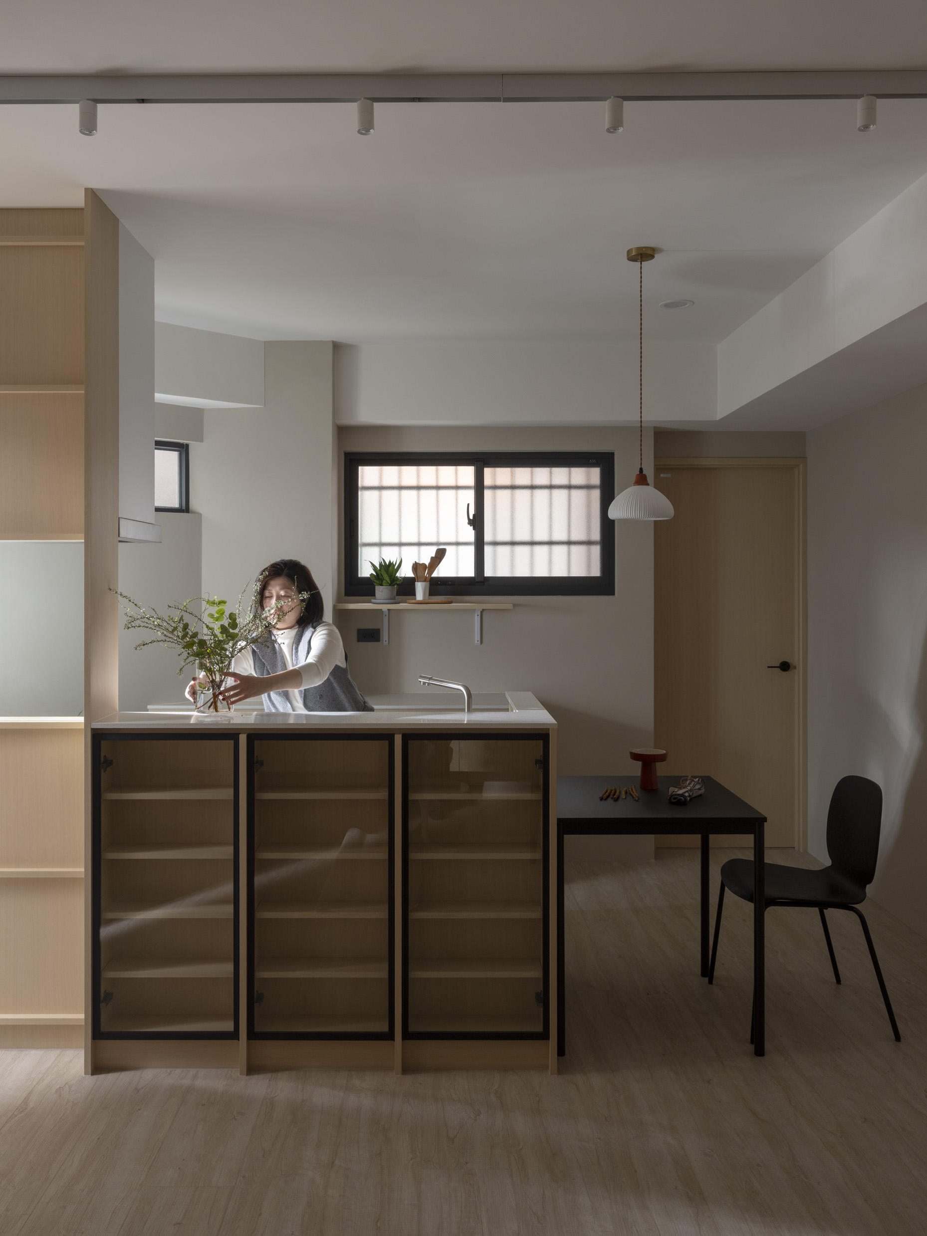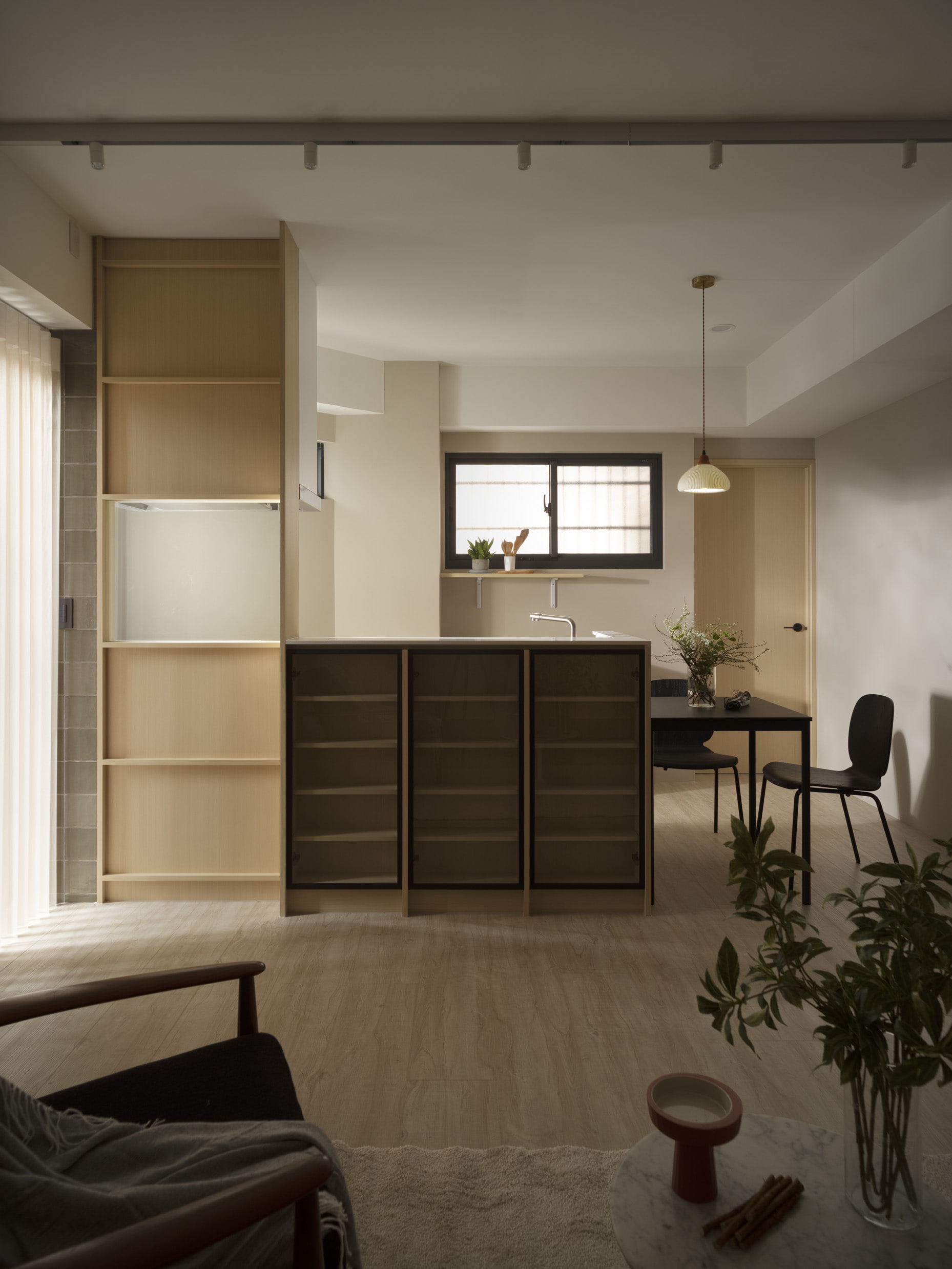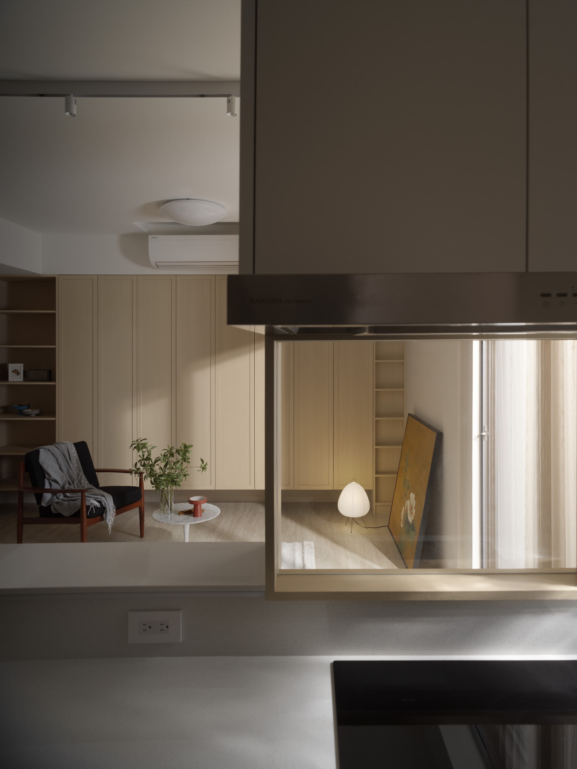 在Japandi風格的小宅中,開放式廚房成為了核心。無明火廚房的設計使得空間更安全,適合家庭使用。廚房通過穿透性的玻璃,將光線引入室內,放大空間的視覺效果,使整個居住空間顯得更為寬敞。。