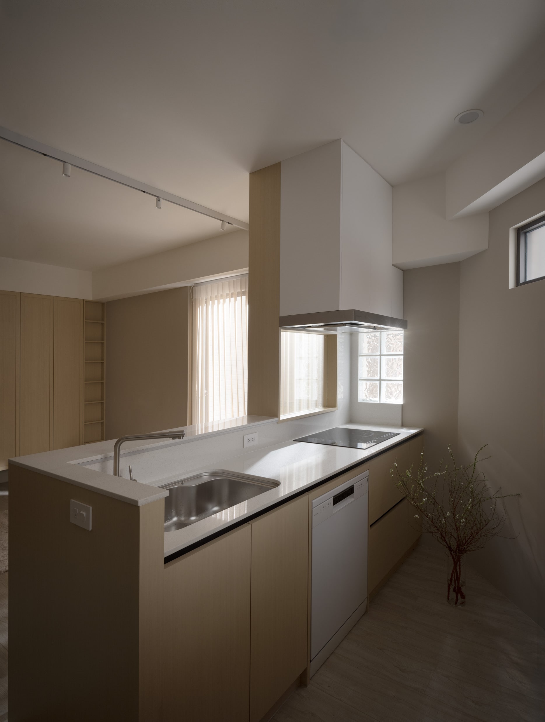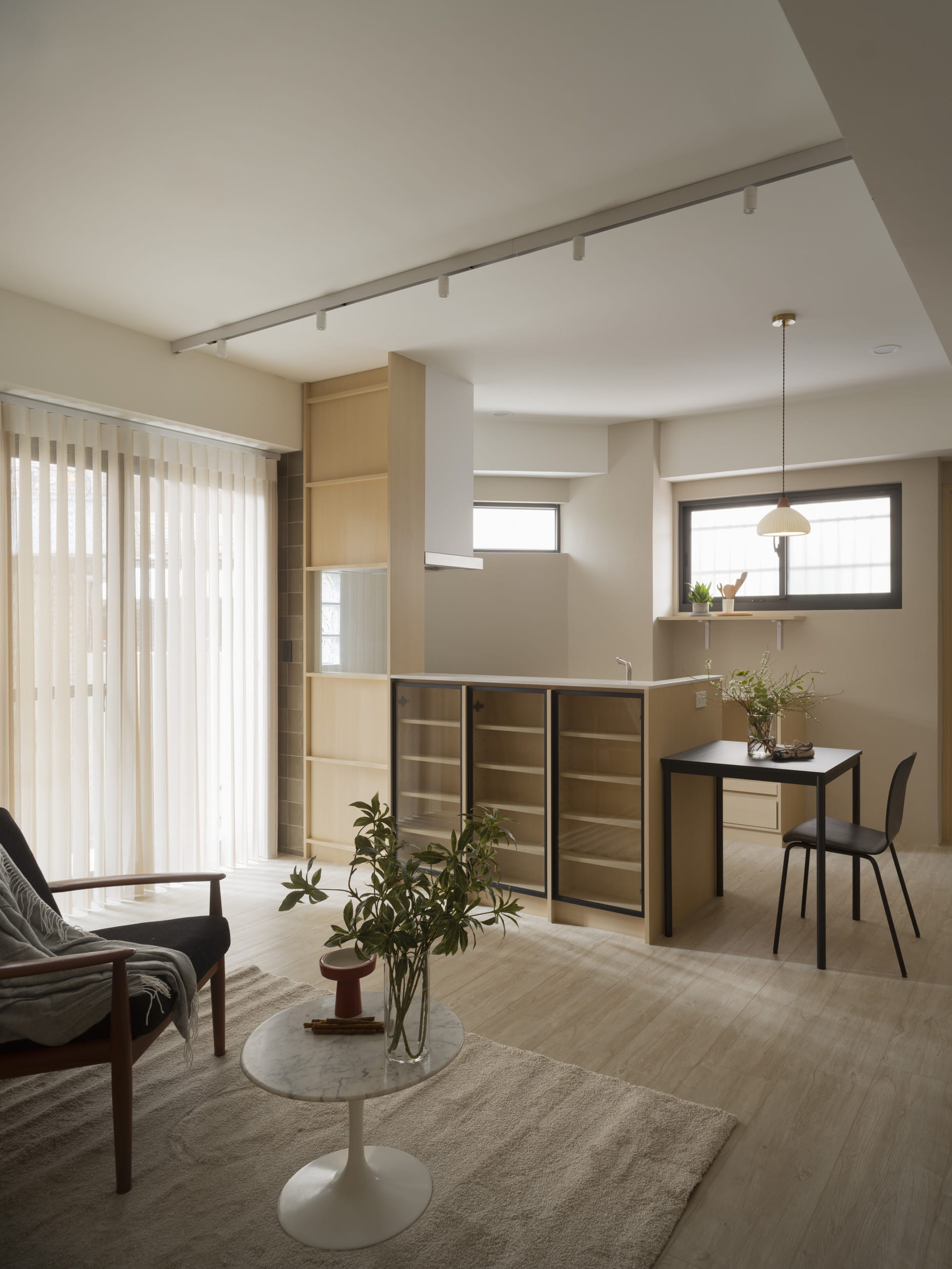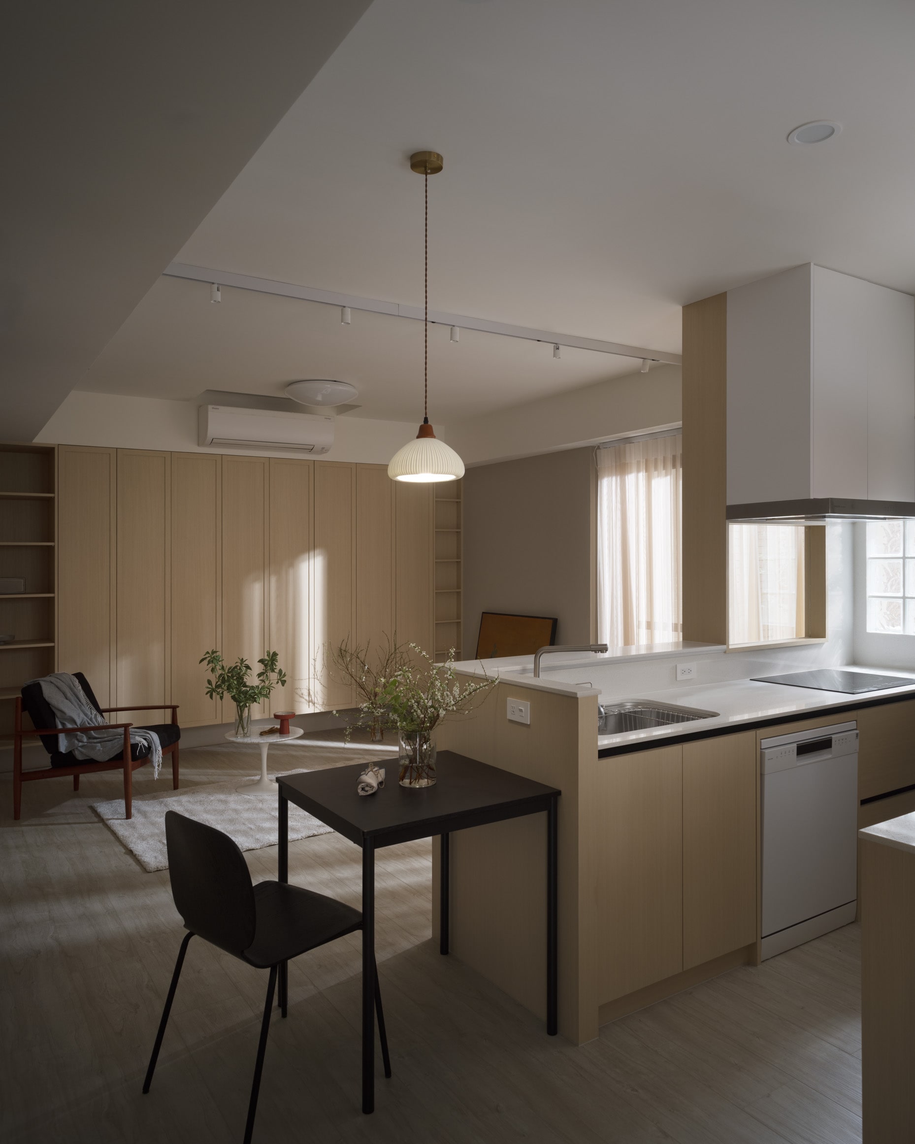 在Japandi風格的小宅中,開放式廚房成為了核心。無明火廚房的設計使得空間更安全,適合家庭使用。廚房通過穿透性的玻璃,將光線引入室內,放大空間的視覺效果,使整個居住空間顯得更為寬敞。。